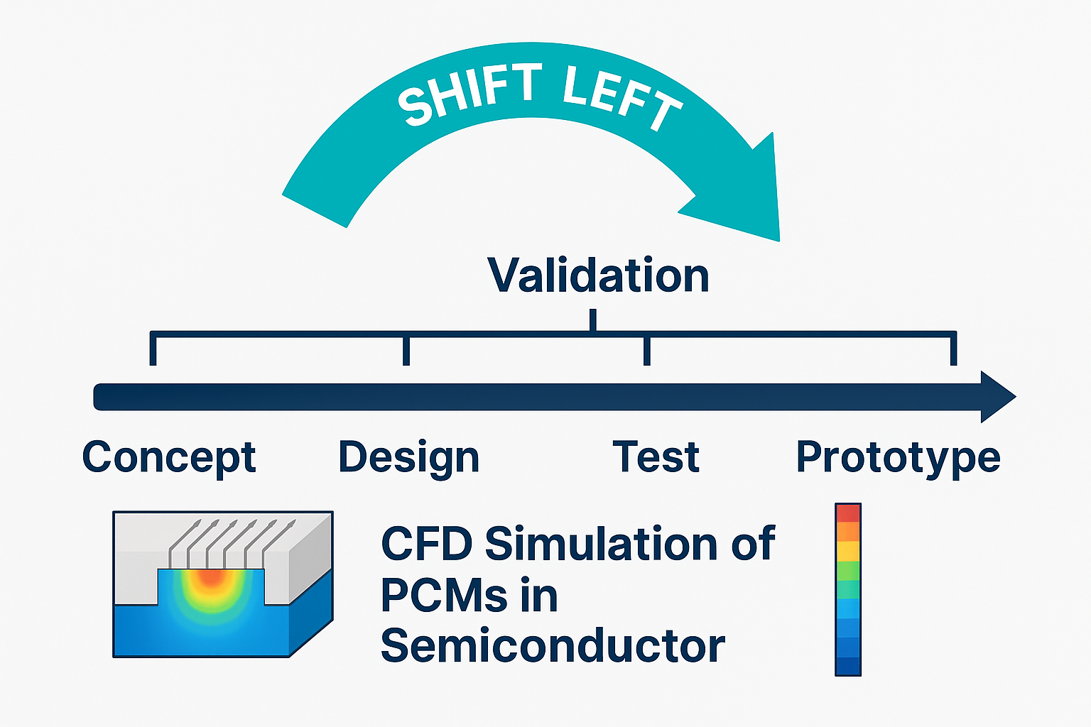 CFD simulations are a promising solution, aligning with the shift-left methodology, for optimizing PCM thermal performance in semiconductor applications. They enable researchers and engineers to model the intricacies of phase change dynamics, including nucleation, growth, and melting behaviors under various operating conditions. By leveraging CFD, one can visualize and analyse temperature gradients, flow distributions, and heat transfer mechanisms within multicompound systems involving PCM.